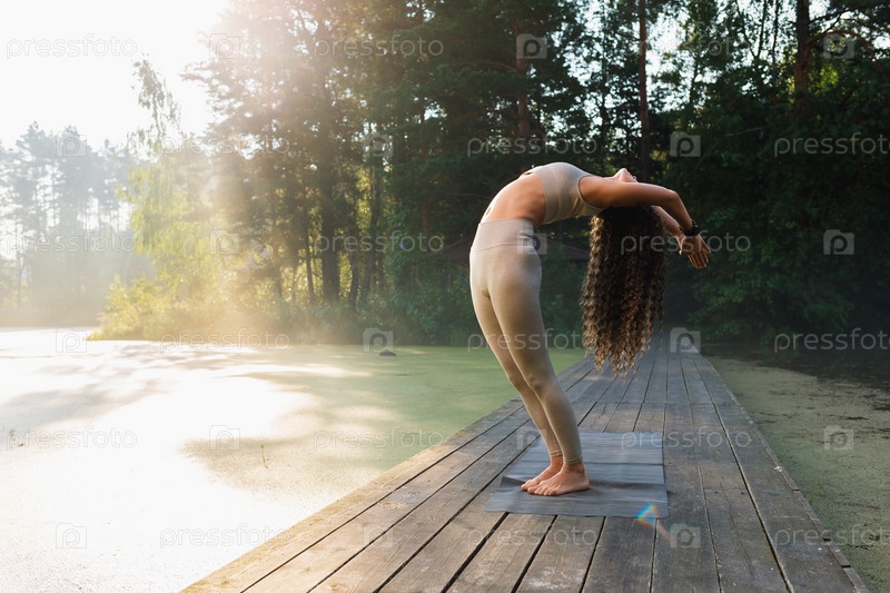 Женщина, практикующая йогу, выполняет упражнение Хаста Уттанасана, прогибается назад, стоит на деревянном мосту солнечным теплым утром в парке у пруда