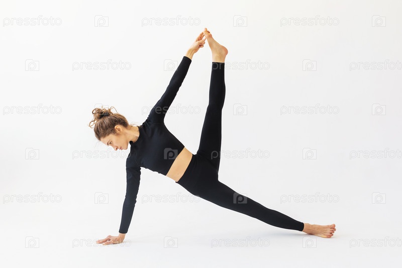Молодая привлекательная женщина, практикующая йогу, выполняет упражнения Васиштхасаны, позу мудреца, тренируется в черной спортивной одежде на белом фоне