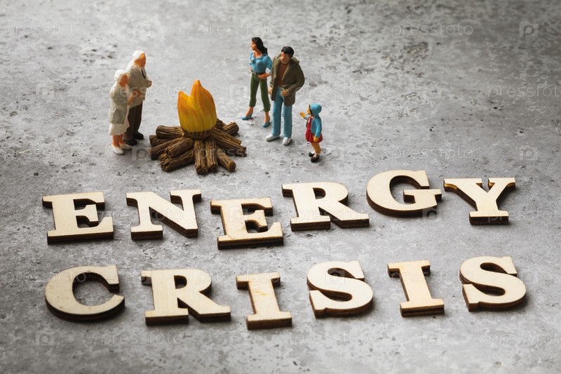 Игрушечные человечки из пластика греются у огня, слова из деревянных букв на столе, концепция на тему энергетического кризиса