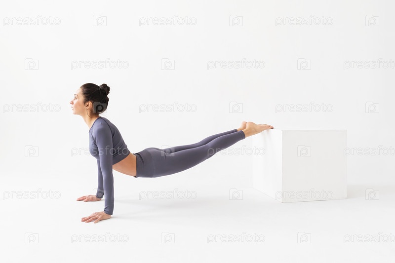 Женщина-тренер в спортивной одежде выполняет прогиб, чтобы растянуть мышцы спины, стоит на руках и опирается на куб, тренируется в помещении на светлом фоне