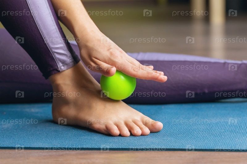 Миофасциальная релаксация гипермобильных мышц стопы и голеностопного сустава массажным валиком, крупный план