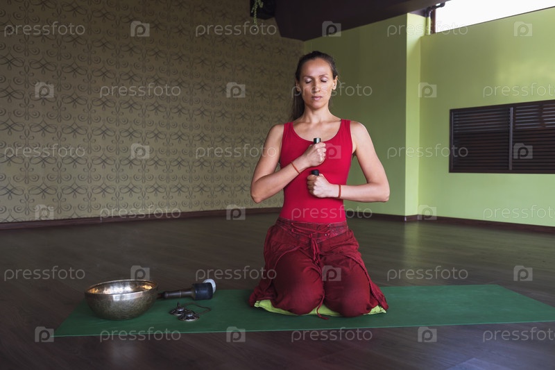 Женщина занимается медитацией с предметами в руках и различными благовониями, сидя на коврике в комнате