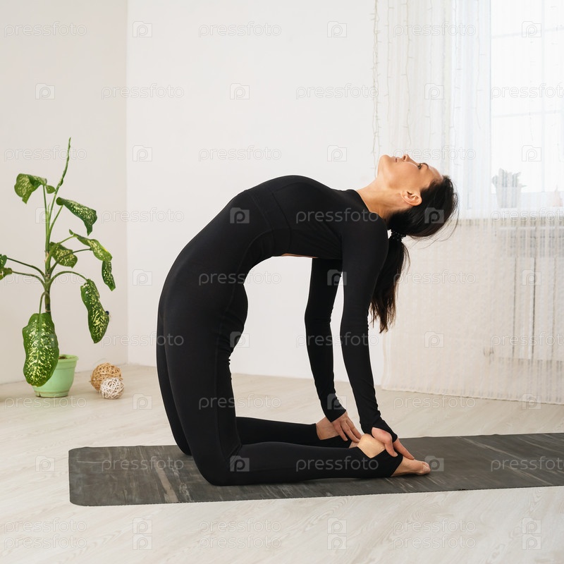 Женщина в черной спортивной одежде занимается йогой, делает упражнение Уштрасана, поза верблюда, тренируется на коврике в комнате у окна