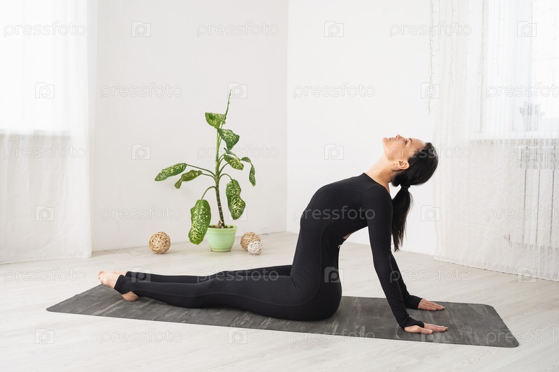 Женщина в черной спортивной одежде занимается йогой, выполняет прогиб назад, тренируется в комнате, сидя на коврике