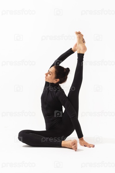 Женщина, практикующая йогу, выполняет вариант упражнения Краунчасана, поза цапли, сидя на белом фоне