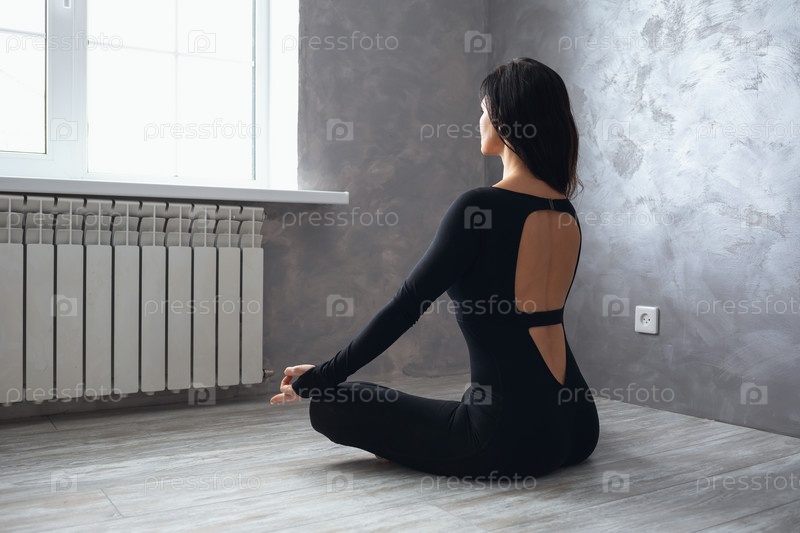 Женщина, практикующая йогу, медитирующая в позе лотоса, сидит в комнате напротив окна