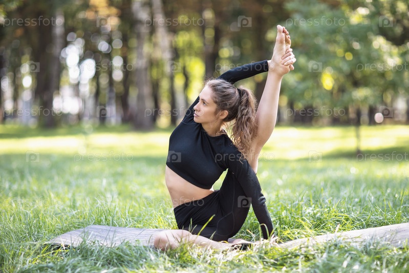 Молодая женщина в черной спортивной одежде практикует йогу, делает упражнения сурья янтрасана, поза компаса, тренируется летним утром в парке, сидя на коврике