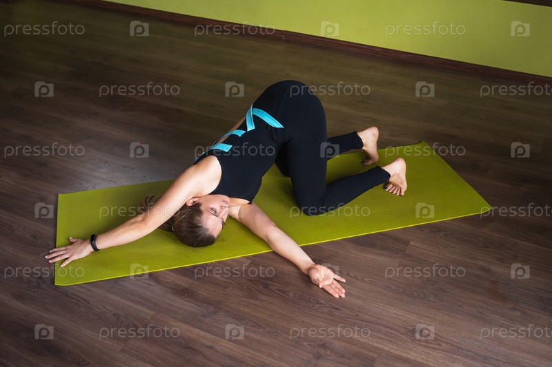 Женщина, практикующая йогу, делает упражнение Эка Бхуджа Свастикасана, асану для плечевого сустава, тренируется в студии в спортивной одежде