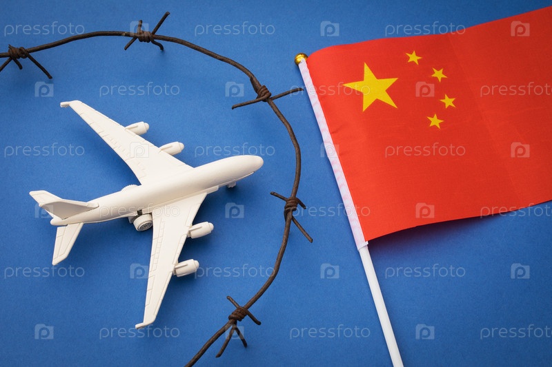 Игрушечный самолет, флаг и ржавая колючая проволока на цветном фоне, концепция закрытия воздушной границы Китая