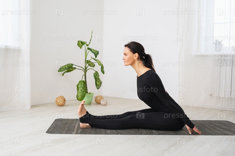 Женщина в черной спортивной одежде занимается йогой, выполняет наклон вперед, тренируется в комнате, сидя на коврике