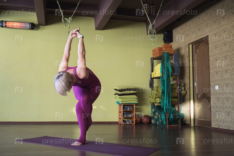 Женщина, ведущая здоровый образ жизни и практикующая йогу, выполняет упражнения гарудасана, поза орла с руками за спиной, тренируется, стоя на коврике в студии