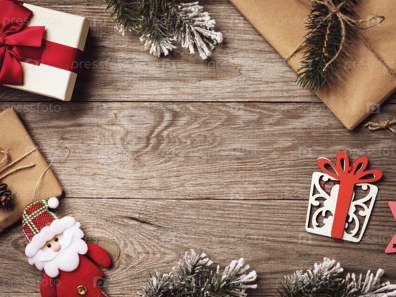 Различные рождественские украшения и подарки на деревянном фоне с копией пространства в центре, вид сверху