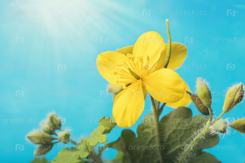 Цветущий чистотел на фоне голубого неба, крупный план