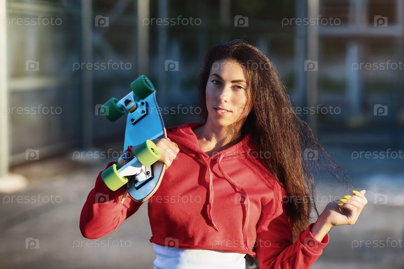 Портрет молодой красивой девушки со скейтбордом в руках летним солнечным вечером