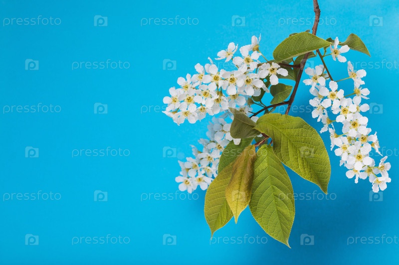Ветвь цветущей черемухи (Prunus padus) на синем фоне с копией пространства