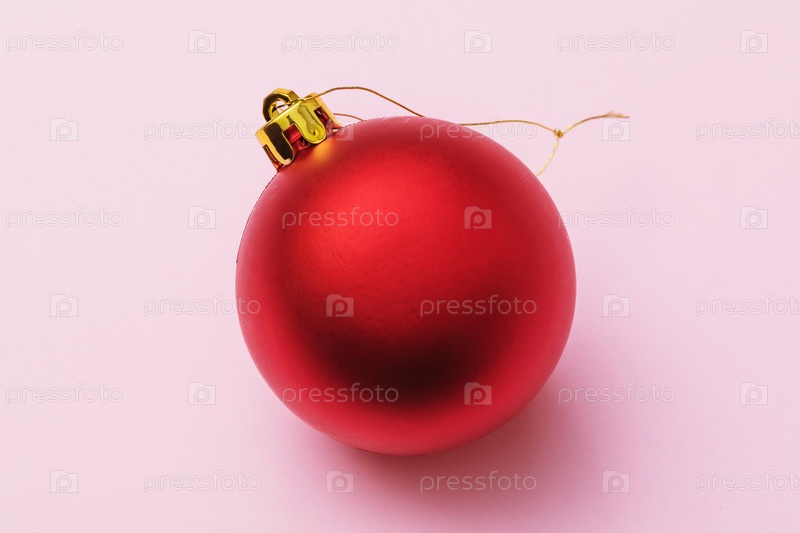 Красная елочная игрушка в виде шара на розовом фоне, вид сверху