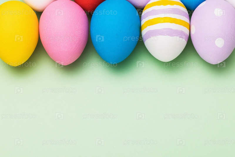 Пасхальные яйца разных цветов на зеленом фоне, вид сверху. Праздничный шаблон с копией пространства