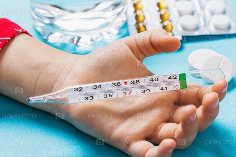 Лечение высокой температуры у детей. Термометр в руке ребенка, крупный план