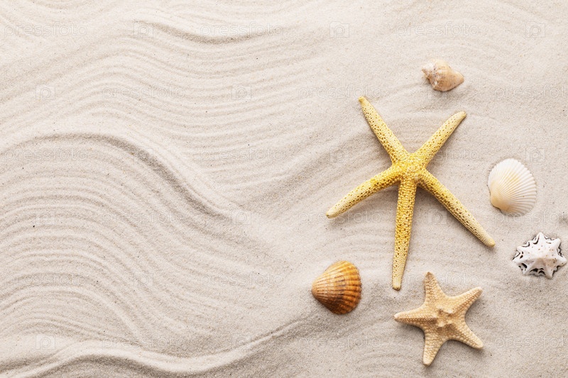 Ракушки на песке с копией пространства, летний фон