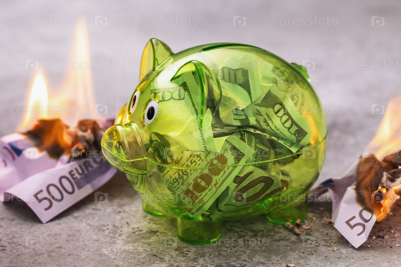 Доллары в прозрачной копилке, окруженной горящими банкнотами евро, концепция сильной мировой валюты