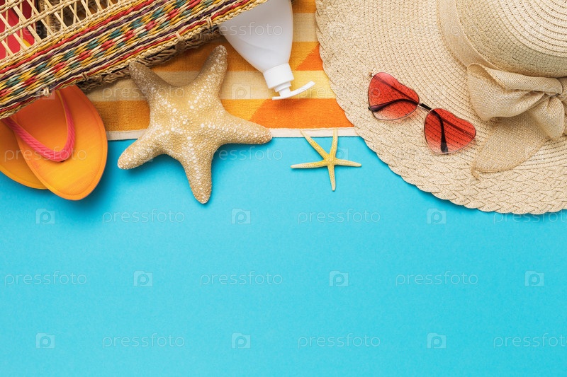 Пляжные аксессуары и декоративные морские звезды на синем фоне с копией пространства, летний фон