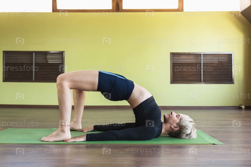 Привлекательная блондинка в спортивных шортах и рашгарде, практикующая йогу, выполняющая двипада-питхасану, позу полумоста