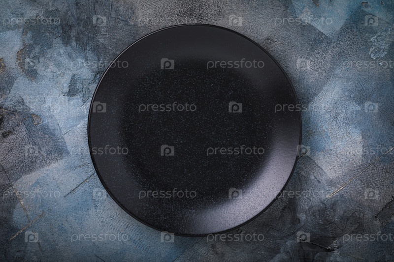 Черная керамическая пластина на абстрактном фоне, вид сверху. Продовольственный фон