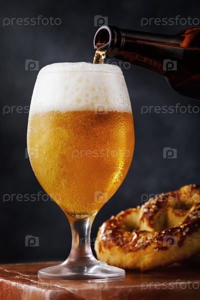 Полный стакан свежего светлого пива с кренделем на каменной подставке