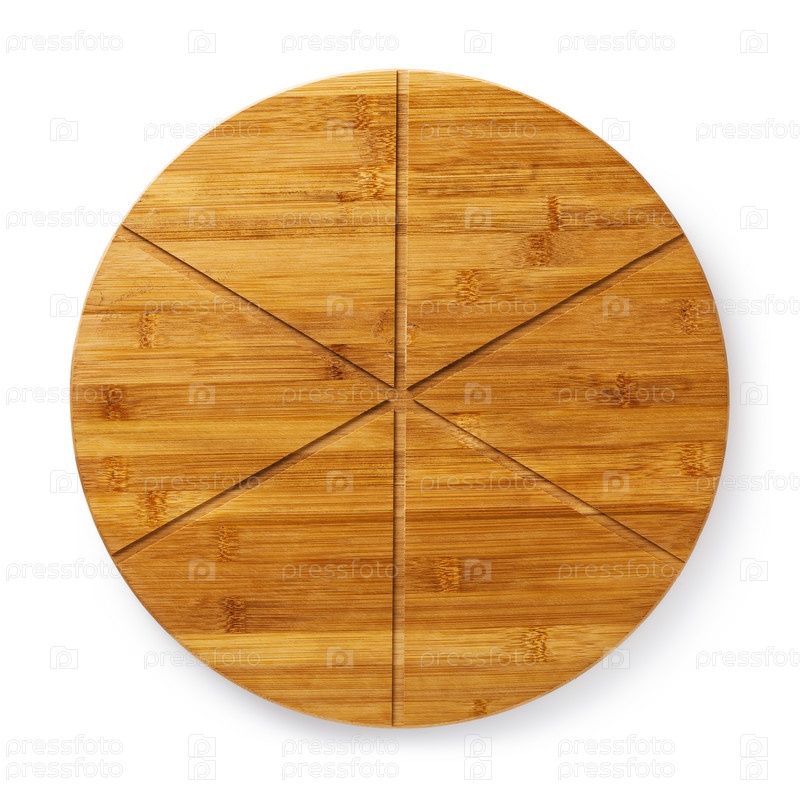 Пустой деревянный поднос для пиццы с секторами для резки на белом фоне