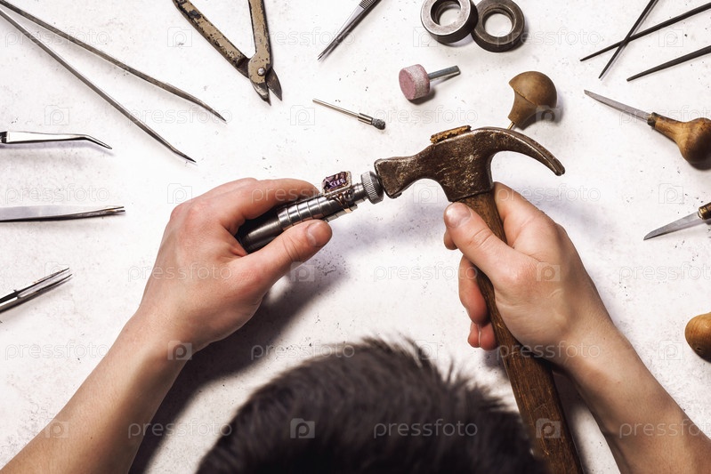 Ювелир увеличивает размер золотого кольца на своем рабочем месте. Вид сверху на производственный процесс в мастерской