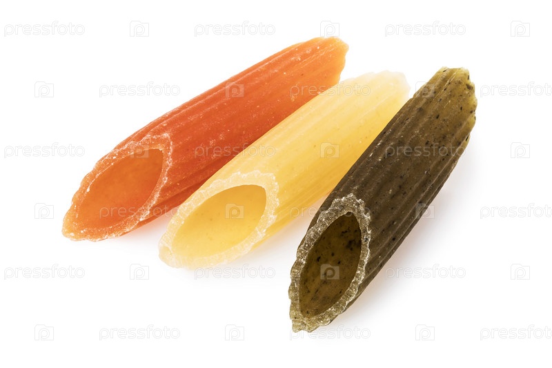 Разноцветные макароны в классической форме из твердых сортов пшеницы, изолированные на белом фоне. Сложенное фото