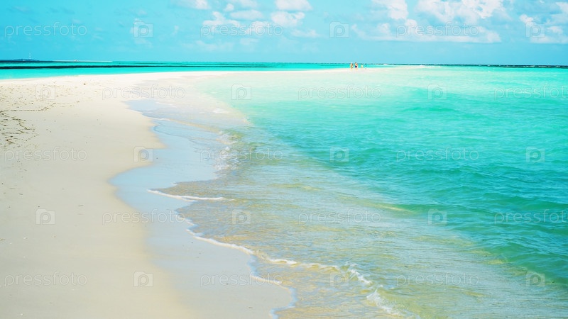 Песчаная коса появляется во время отлива на острове Лавиани, Мальдивы