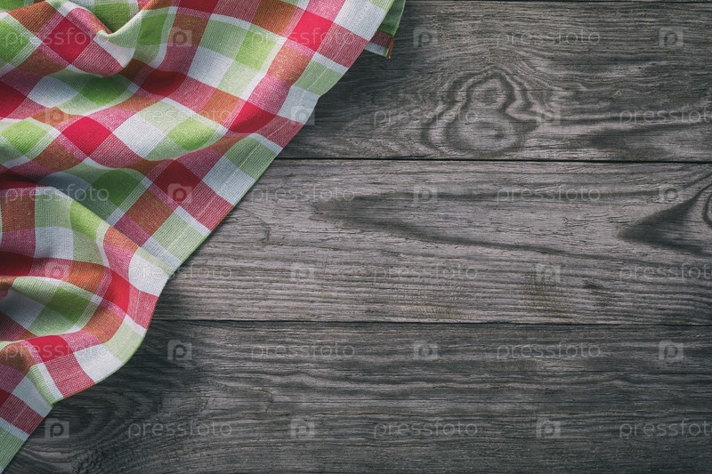 Вид сверху на разноцветную скатерть с левой стороны деревянного стола. Продовольственный фон