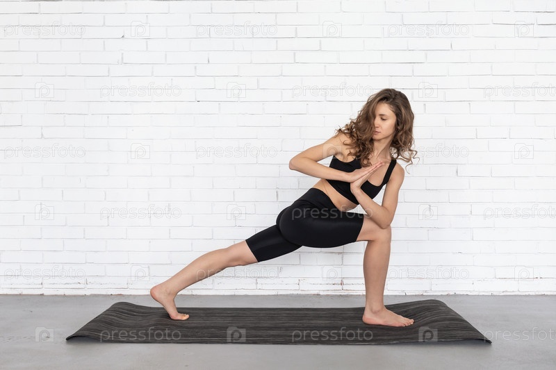Молодая женщина, ведущая здоровый образ жизни и практикующая йогу, выполняет упражнения паривритта паршваконасана, развернутую позу бокового угла, тренируется в черной спортивной одежде у стены
