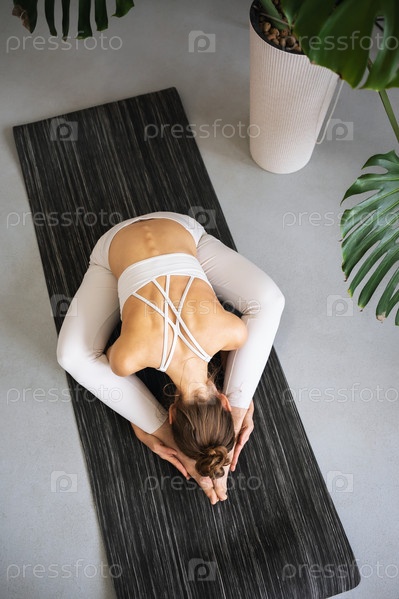 Молодая девушка, ведущая здоровый образ жизни и практикующая йогу, тренируется, сидя на коврике в белой спортивной одежде в комнате