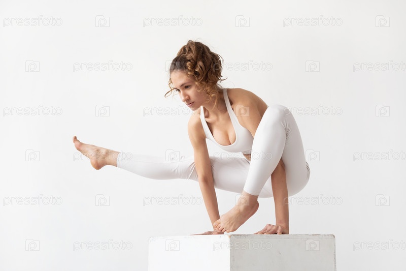 Молодая женщина, ведущая здоровый образ жизни и практикующая йогу, выполняет упражнение эка пада бхуджапидасана, стойку на руках на белом кубе, тренируется в белой спортивной одежде на светлом фоне