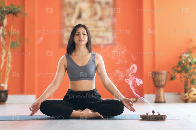 Молодая женщина занимается медитацией, сидя в позе лотоса с джняна мудрой на коврике в студии, практикуя йогу с благовониями