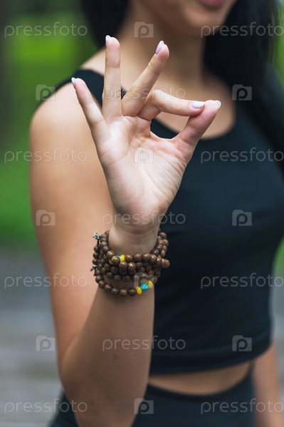 Женщина, практикующая йогу, показывает знак джняна мудры, практикует медитацию без стресса, занимается спортом в парке, крупным планом