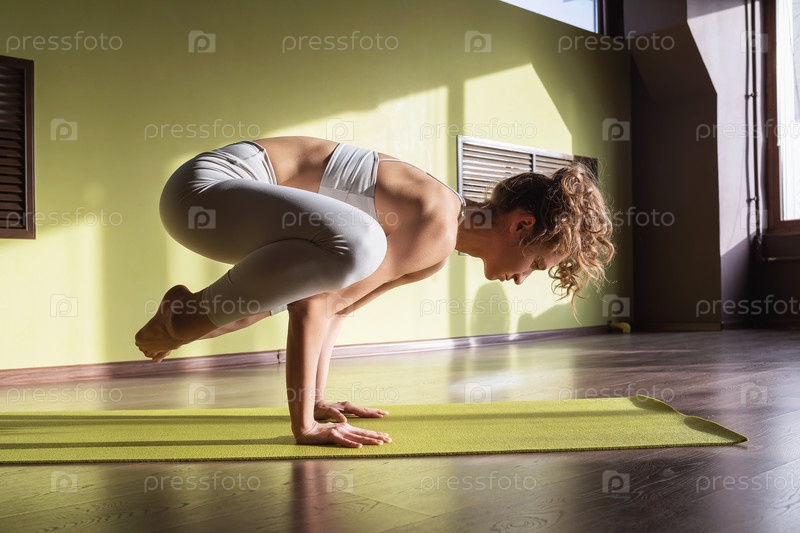 Молодая женщина, ведущая здоровый образ жизни и практикующая йогу, выполняет упражнения бакасаны, позу журавля, балансирующую асану, тренируется в белой спортивной одежде на коврике в студии