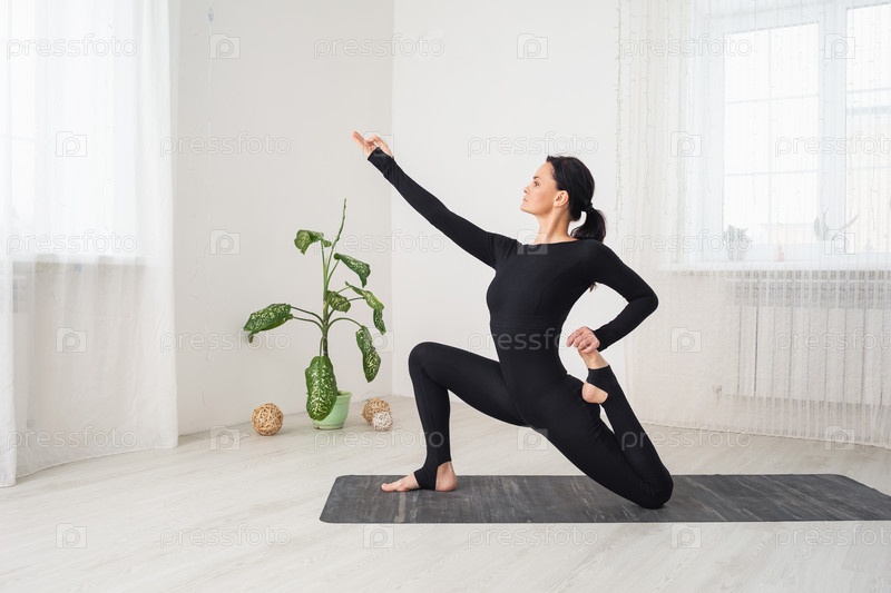 Женщина в черной спортивной одежде практикует йогу, делает упражнения анджанеясаны с вирасаной, поза с низким выпадом, сидит на коврике в комнате у окна