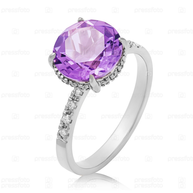 Красивое кольцо из белого золота с большим аметистом и маленьким кубическим цирконием, изолированное на белом фоне