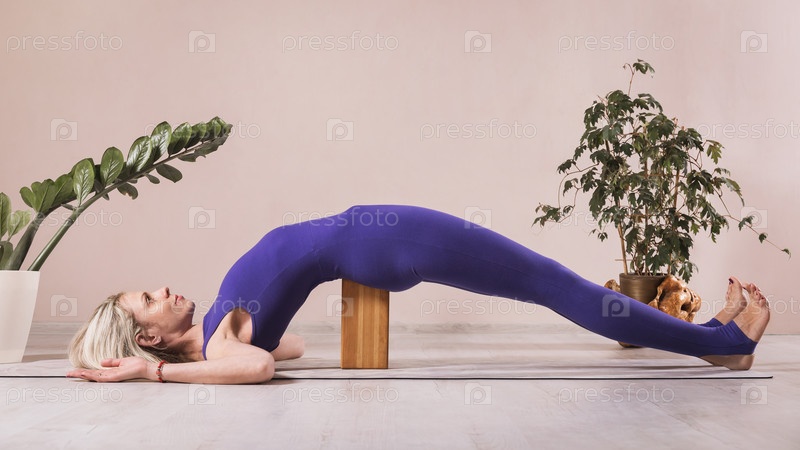 Женщина практикующая йогу, занимающаяся сето бандха сарвангасаной с деревянным блоком для йоги, тренирующаяся на коврике в студии у стены