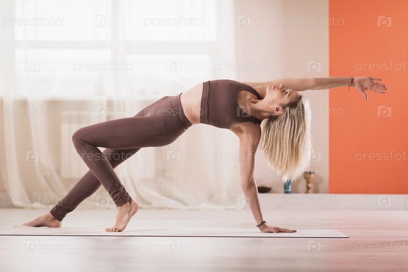 Привлекательная блондинка в спортивной одежде, практикующая йогу, выступает в комнате, стоит на коврике, выполняет упражнение каматкарасана, танцует в позе собаки