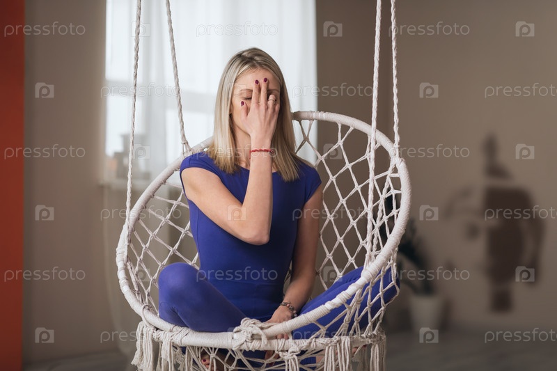 Красивая блондинка в синей спортивной одежде, практикующая йогу, занимается медитацией в позе лотоса, сидит в висячем кресле в комнате, показывает символ джняна мудры возле лица