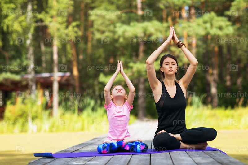 Мама и дочь занимаются йогой в парке, сидя на деревянном мосту теплым летним утром