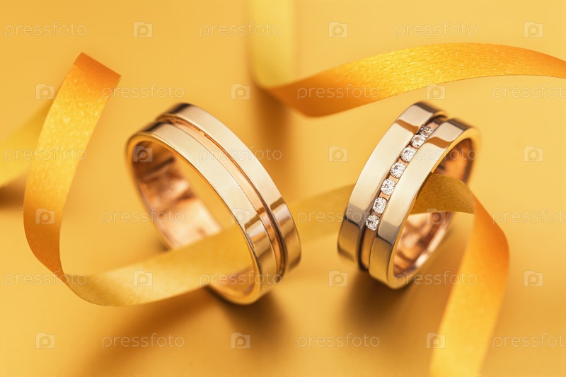 Два обручальных кольца, соединенные лентой на желтом фоне, макрос