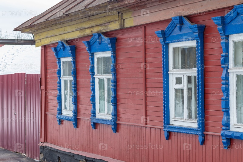 Одноэтажный старый деревянный дом в маленьком провинциальном городке. традиционная отделка, резные ставни