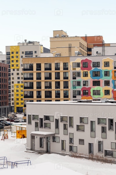 Современный многоквартирный дом с красочными фасадами на окраине города. Москва, Россия