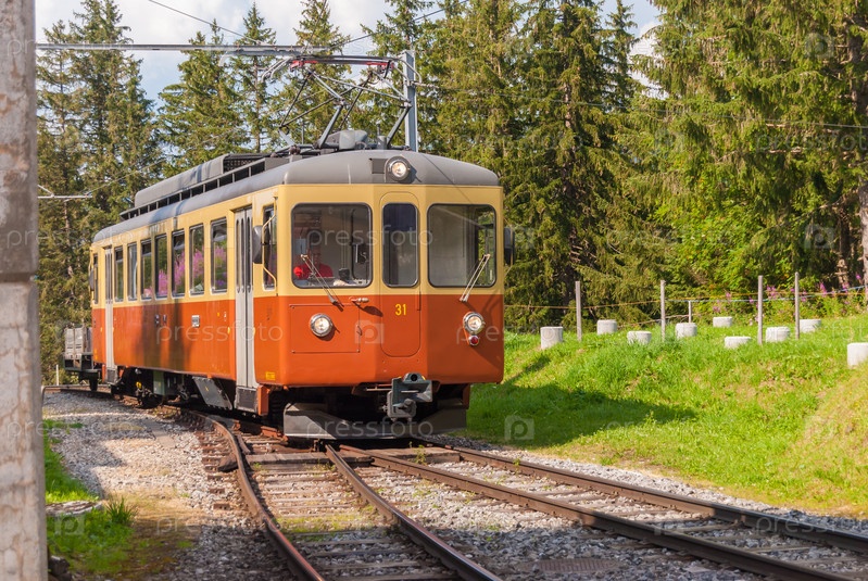 Поездка на поезде по высокой долине в швейцарских Альпах