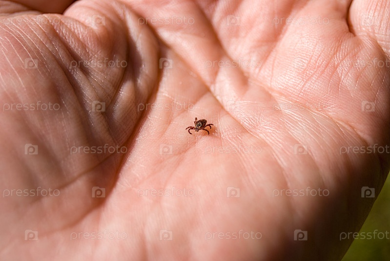 Клещ Ixodes ricinus ползет по коже человека. энцефалитический клеща. этот вид животных является носителем боррелия